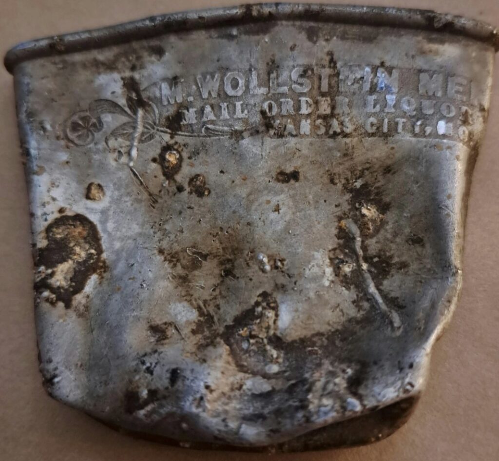 It’s a metal shot-glass size cup from M. Wollstein Mercantile Co. of Kansas City, MO. Here’s one from the database to show you what the non-flattened version looks like: