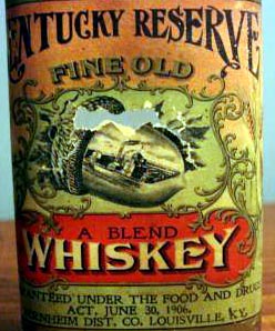 A clear glass bottle with a full paper label that once contained "Old Kentucky Reserve Whiskey", from the Bernheim Distilling Co. of Louisville, KY. It has a capacity of one pint. The label refers to the Food and Drug Act of 1906 and contains the trademark Berheim acorn.