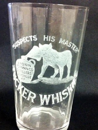 I think the "Suspects His Master" shots feature a design that ranks among my pre-pro favorites and they're tough to find. The glass at right above is a highball though, which is usually the kiss of death for a pre-pro glass. Highballs always seem trapped in pre-pro limbo - too tall to appeal to a shot collector (and too tall to fit in the display case) and too much of an ardent spirit to appeal to a beer collector. They usually sell for pennies, the main interest coming from brand collectors -- collectors who hunt Red Top Rye whiskey bottles, corkscrews, shots, highballs, beanie babies, etc. being a classic example. But - these were the old rules. The pouting pooch above triggered a knock-down, drag-out fight between xxxtruk, churncreek, and The Scooter, the latter winning it for $255.00. Hmmmmm.