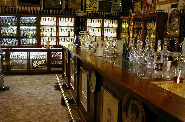 Moving clockwise, we're now standing close to the far end of the room looking back at the left-hand wall. At left in the photo is the third of the three large shot-glass displays. At right is a bar covered with signage, with a collection of antique spittoons nestling below the foot rail. The bar top is congested with the less valuable decanters and back-bars. The good ones are kept safe in display cases against the wall at right.