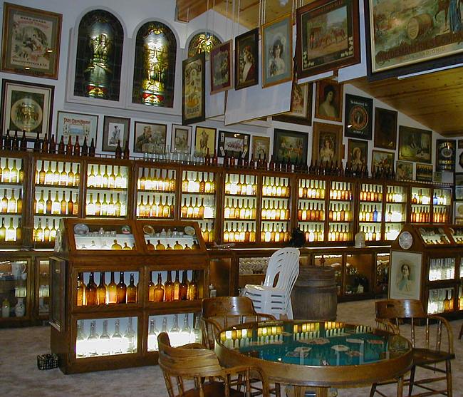 Looking left, we now take in the long wall of whiskies (to the right of us when we originally entered the room). The gaming table in the foreground houses displays of cards, poker chips and celluloid-backed advertising mirrors beneath a modern glass top. The original wooden cover was used in construction of the table in the doorway: it was designed to be removed when a game was in the offing.