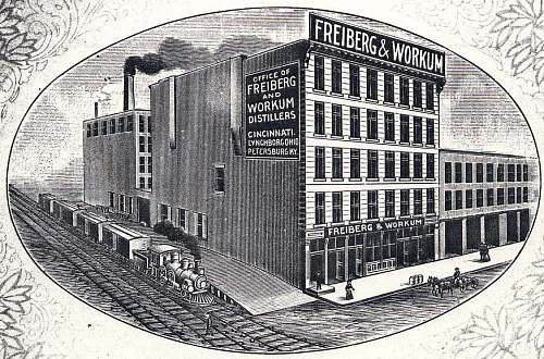 Our senior, Mr. Julius Freiberg, came to Cincinnati from his fatherland in 1847, and shortly thereafter proceeded to Williamstown, in Kentucky, where he carried on a general merchandise business for several years. It was here, and in the surrounding Blue Grass country, where his business called him, that he became acquainted with the leading Kentucky distillers, and their products. At that time Kentucky whiskey was scarcely known outside of that State, and he, in fact, brought into Cincinnati the first Bourbon whiskey imported from Kentucky for trade purposes.