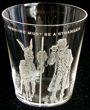 GOSH!HE MUST BE A STRANGER(text runs just below rim. Below the line of text is a highly-detailed, frosted picture of an ass at left, a pole with an old-fashioned telephone attached to it in the middle, and an elderly black male in a waistcoat and coat at right, holding a telephone earpiece to his ear).