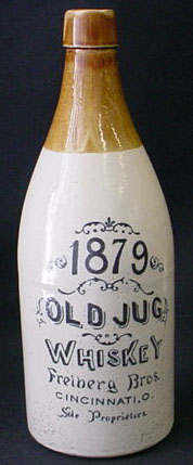 A glazed stoneware bottle that once held "1879 Old Jug" whiskey, from Freiberg Bros. of Cincinnati, OH. The bottle stands 10-3/4" tall and is 3-7/8" in diameter.