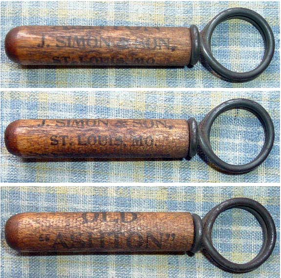 A Clough-type corkscrew with a wooden sheath that advertises "Old Ashton" brand whiskey, from J Simon & Son of St. Louis, MO. It measures about 3-1/2" long when sheathed (as shown).