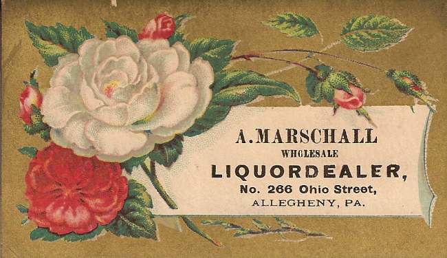 A trade card from A Marschall of Allegheny, PA (now Pittsburgh). It measures 2-1/2" x 4-3/16".