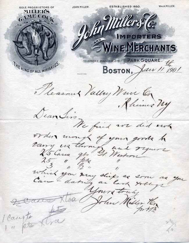 A letter from John Miller & Co. of Boston, MA. It is dated Jan. 11, 1901 and features a detailed engraving of their Miller's Game Cock trade mark. The letter measures 8-3/8" x 10-3/4".