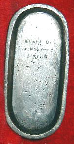 A metal paperweight from J & A Freiberg, Distillers of Cincinnati, OH. It is made in the form of a Daschund and measures 4" in length, 1-7/8" wide, 2-1/2" high. One side of the base is embossed with "COMPLIMENTS OF J & A FREIBERG", the obverse reads "CINCINNATI OHIO". The bottom is stamped "JANUARY 1ST 1896"
