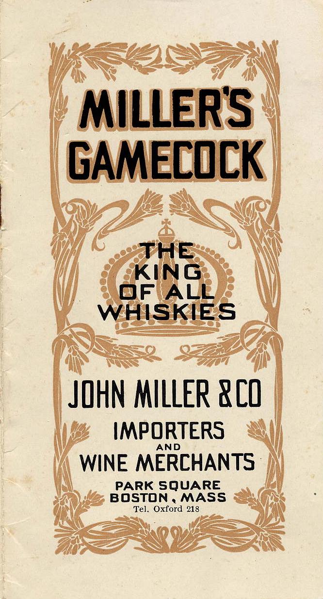 A booklet advertising Gamecock Rye whiskey, from John Miller & Co. of Boston, MA. It is undated. The booklet measures 3-1/2" x 6-1/4" and consists of 8 pages shown here in pairs. [ see rear cover ] [ see inside ]
