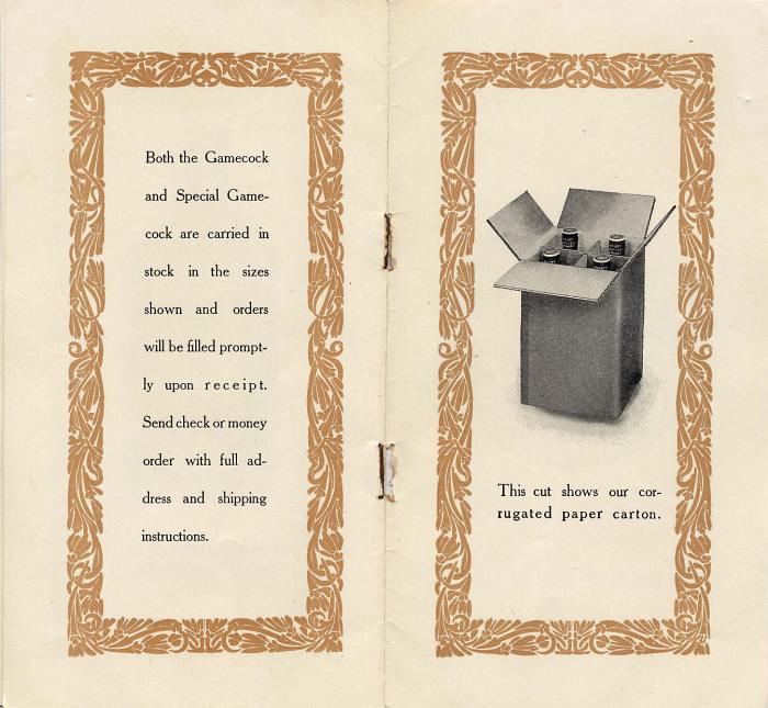A booklet advertising Gamecock Rye whiskey, from John Miller & Co. of Boston, MA. It is undated. The booklet measures 3-1/2" x 6-1/4" and consists of 8 pages shown here in pairs. [ see previous two pages ] [ see rear cover ]