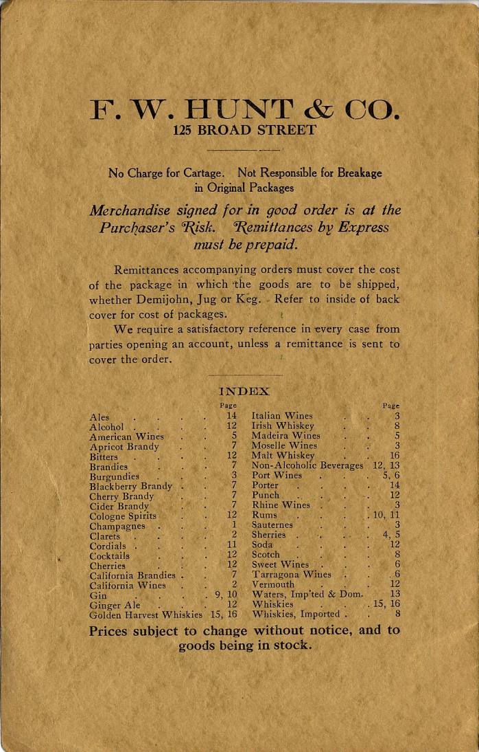 A booklet listing prices for various wines and liquors sold by F. W. Hunt & Co. of Boston, MA. It measures 5-1/2" x 8-1/2" and contains 16 pages (plus covers). It is undated save for a reference to the 1906 Pure Food law, and a pencil notation on the cover suggesting that it was published in 1917. [ see front cover ] [ see p. 1 ]