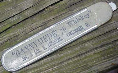 A metal nail file advertising Gannymede "76" whiskey from Sig. & Sol. H. Freiberg of Cincinnati, OH. It measures 3-15/16" in length; the obverse is unmarked.