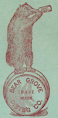 The company used the brand names: "'Possum Creek", "Beargrove", "Beargrove "A"", "Beargrove "C"", "Beargrove "F"", "Beargrove B. S.", "Beargrove Booster", "Beargrove Kentucky Sour "K K"", "Beargrove Kentucky Sour "K"", "Beargrove Maryland Rye "R"", "Beargrove White Corn "CC"", "Beargrove White Rye "R"", "Owl Cave", and "Shady Dale." |  | Business name timeline: Beargrove Distributing Co.